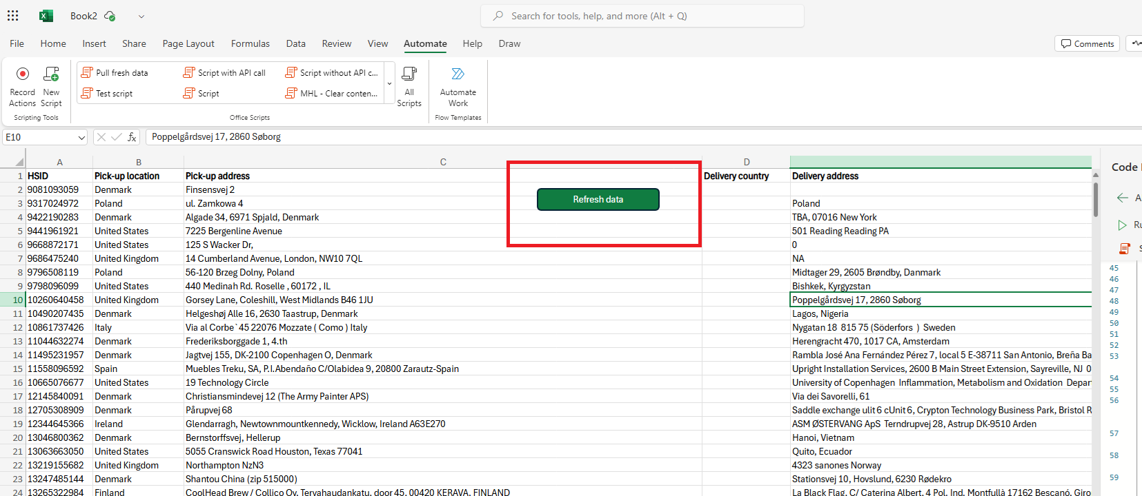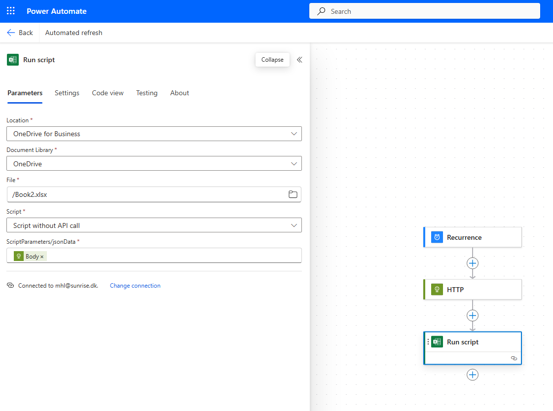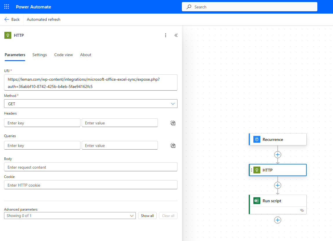 - In PowerAutomate, every 10 minutes HTTP Request will be created to the second script. Once that data is pulled from the server, it will be sent to Excel function that will create rows from it in the actual Excel sheet. Olde data will first get removed and then replaced by the new one (to make sure that there are no leftovers there).